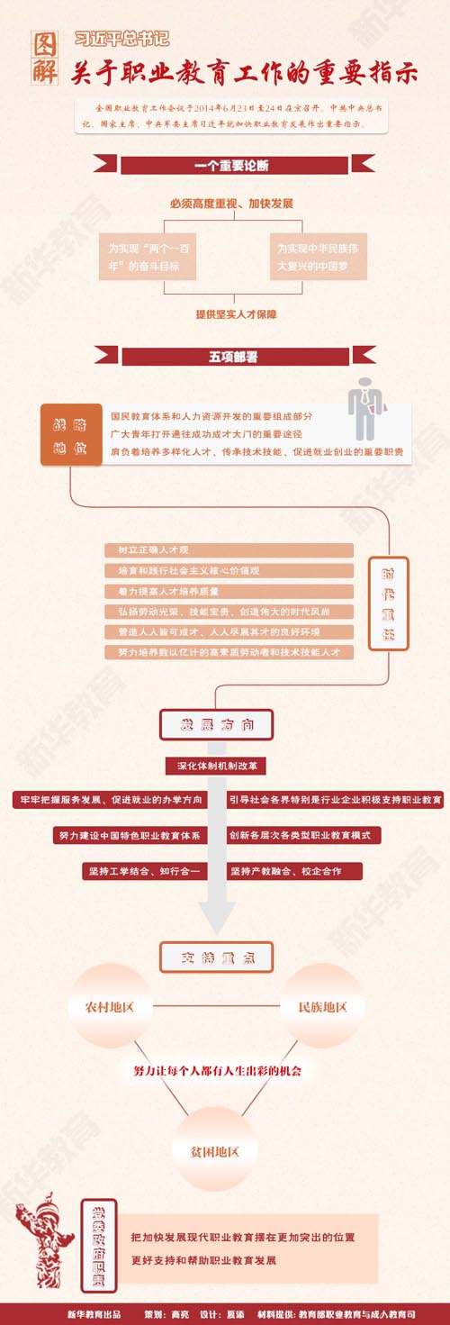 鲁昕强调,各地各部门要深刻领会习总书记重要批示和全国职教会精神,加强各级各类职业教育的统筹,将发展职业教育纳入现代化建设总体部署,作为深化教育领域综合改革的战略切入点、突破口和转方式调结构惠民生的战略支点,同步规划职业教育与经济社会发展,协调推进人力资源开发与技术进步,推动教育教学改革与产业转型升级衔接配套,推动职业教育深化改革创新、实现科学发展。