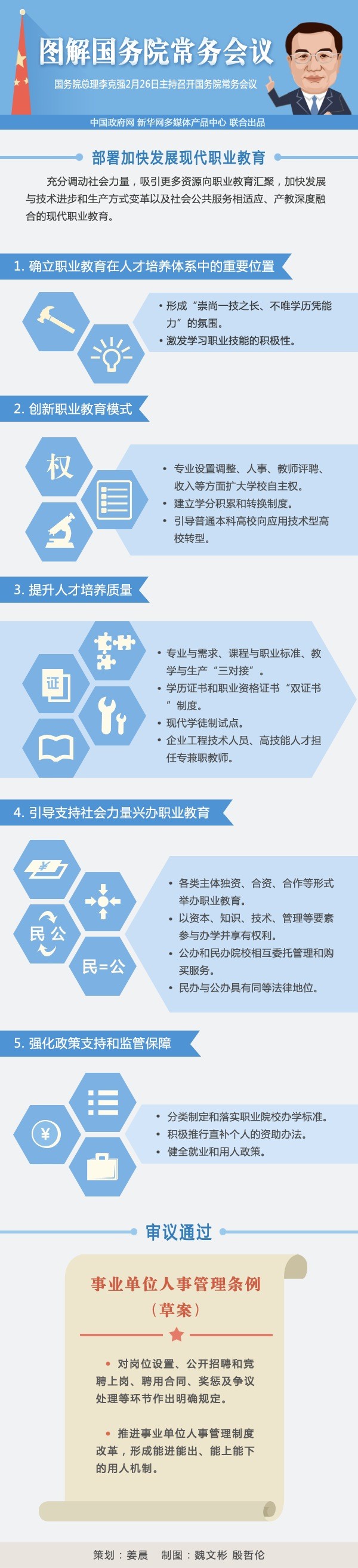 新华社北京2月26日电 国务院总理李克强2月26日主持召开国务院常务会议,部署加快发展现代职业教育,审议通过《事业单位人事管理条例(草案)》。