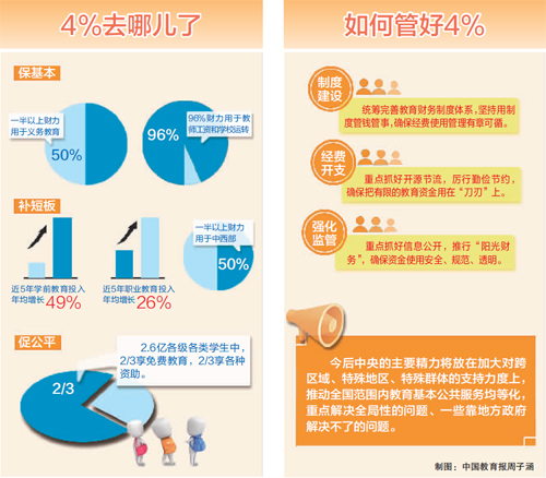 一系列深化改革的举措,需要更加强大的物质保障。2013年3月5日,中国政府宣布:国家财政性教育经费2012年占国内生产总值比例达到4%。为了实现这个20年未能实现的目标,国家和地方以一系列创新之举确保老百姓的“读书钱”花得起、用得好。教育部还进一步完善制度,健全监管,强化公开,提升专业化水平,推行绩效评价和奖补机制,让国家财政投入的每分钱都能用于教育、服务人民。